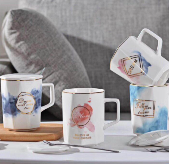歐式小清新水墨風創意陶瓷馬克杯子帶蓋勺情侶咖啡杯簡約字母禮品